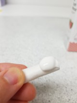 - Wash your hands and apply pea size amount to the back of your hand. Then apply another same sized amount next to the first one (see photo). Now you have one dosage for your upper teeth and one for your lower teeth. This is the minimum dosage.